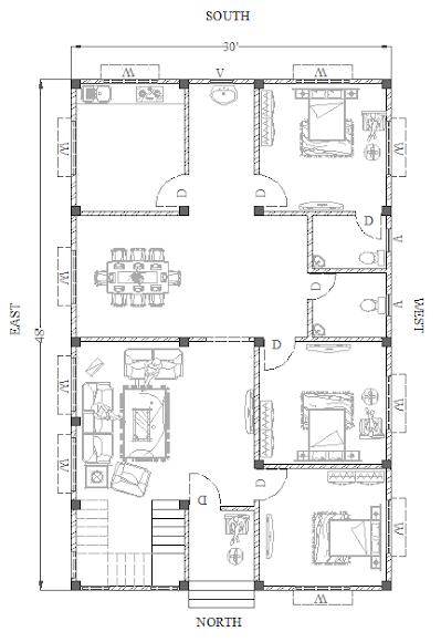 30′-0”x48′-0″ 3 BED ROOM, DRAWING ROOM, OPEN KITCHEN DINNING AREA ,ONE ATTACH TOILET, ONE COMMON TOILET ,FRONT BALCONY GROUND FLOOR =1440 SQUARE FEET